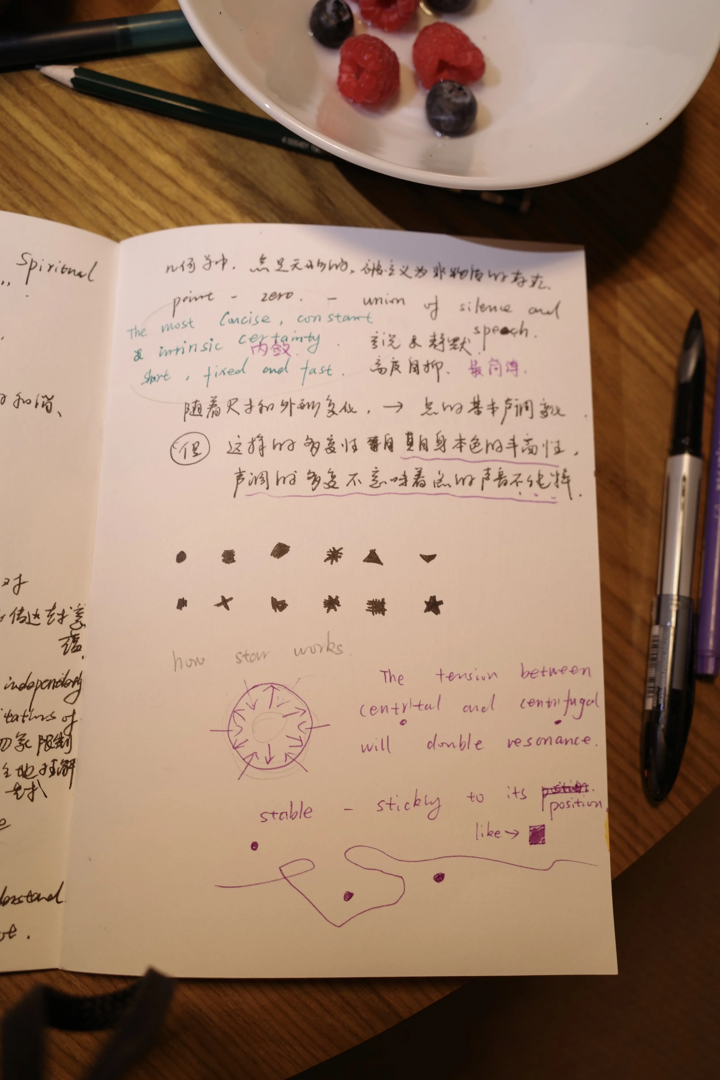 The rain in the UK was coming down from all directions in excellent filaments, and with the strong winds, the force of the rain itself as a unit was intensified and was in two states of rebound and entrapment as it came into contact with the surface of the pool so that I heard four sounds from the unit filaments. (According to Kandinsky, the tendency of a point to move is from the centre of the base surface outwards, forming a centrifugal structure. This means that when a moment occurs, we hear two kinds of sound: the absolute proprioception of the point and the sound of a given position in the plane.)